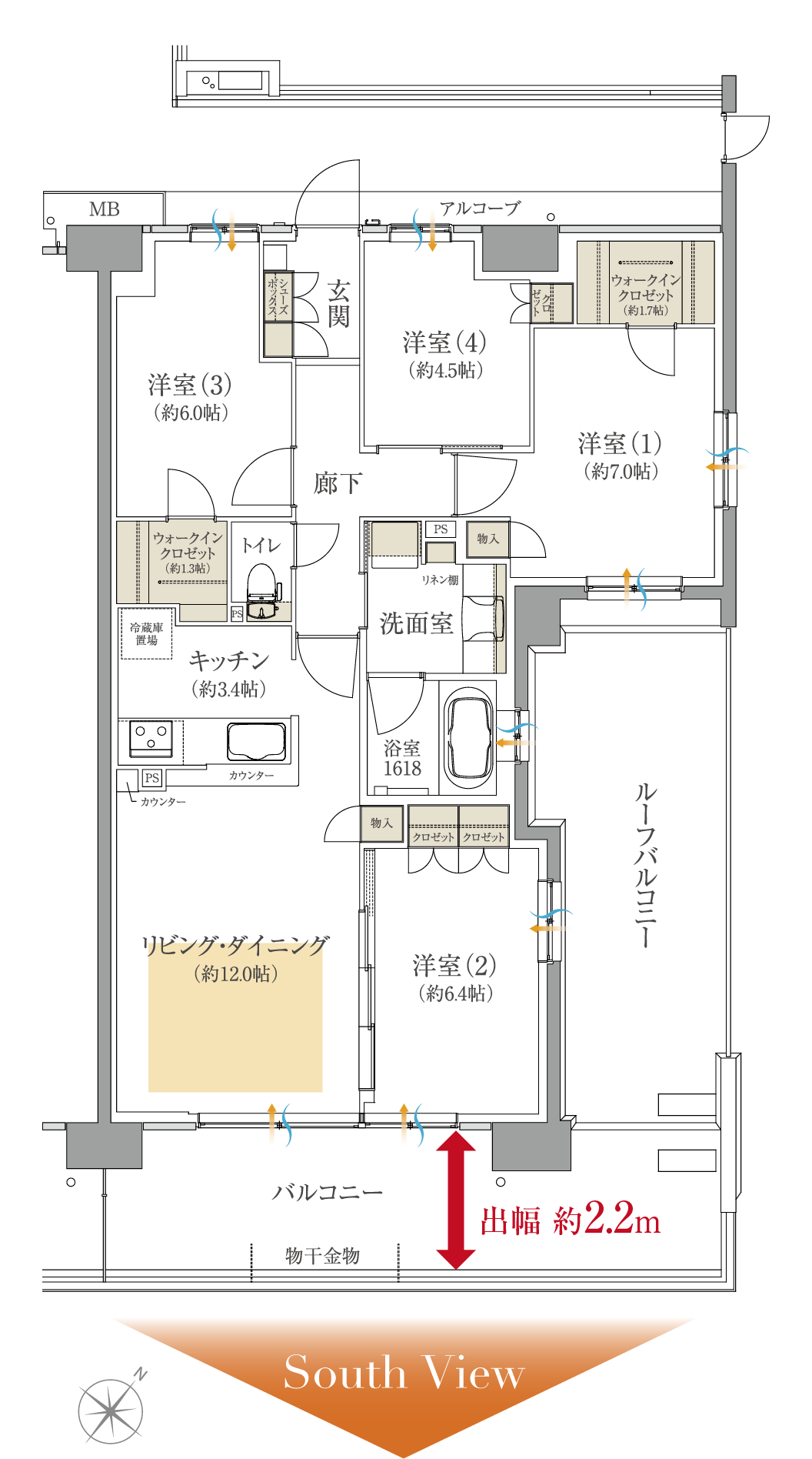 - 随開放的で広々としたルーフバルコニー付き角住戸